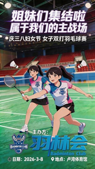 【羽毛球】3月8日周日中午12:00三八女双娱乐赛(卢体)